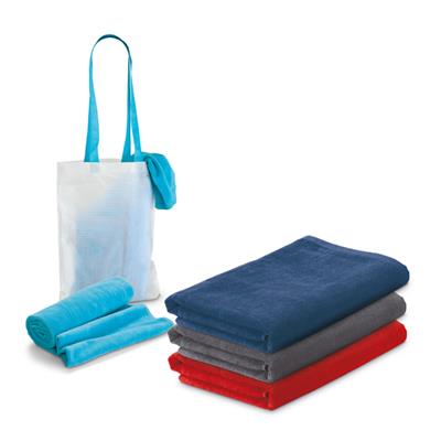 Toalha de praia AZ98375. Veludo de algodão: 320 g/m². Fornecida com sacola em non-woven (80 g/m²). 1500 x 750 mm | Sacola: 330 x 415 x 100 mm