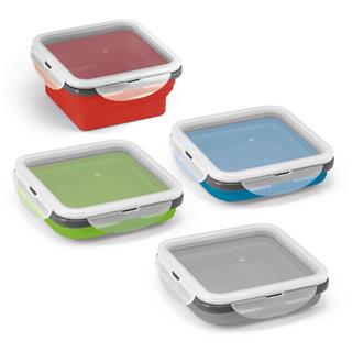 Marmita retrátil em silicone e PP AZ93846 com 1 compartimento e capacidade até 580 ml. Apta para microondas (retirar a tampa). Food grade. 138 x 138 x 64 mm | Dobrada: 138 x 138 x 34 mm